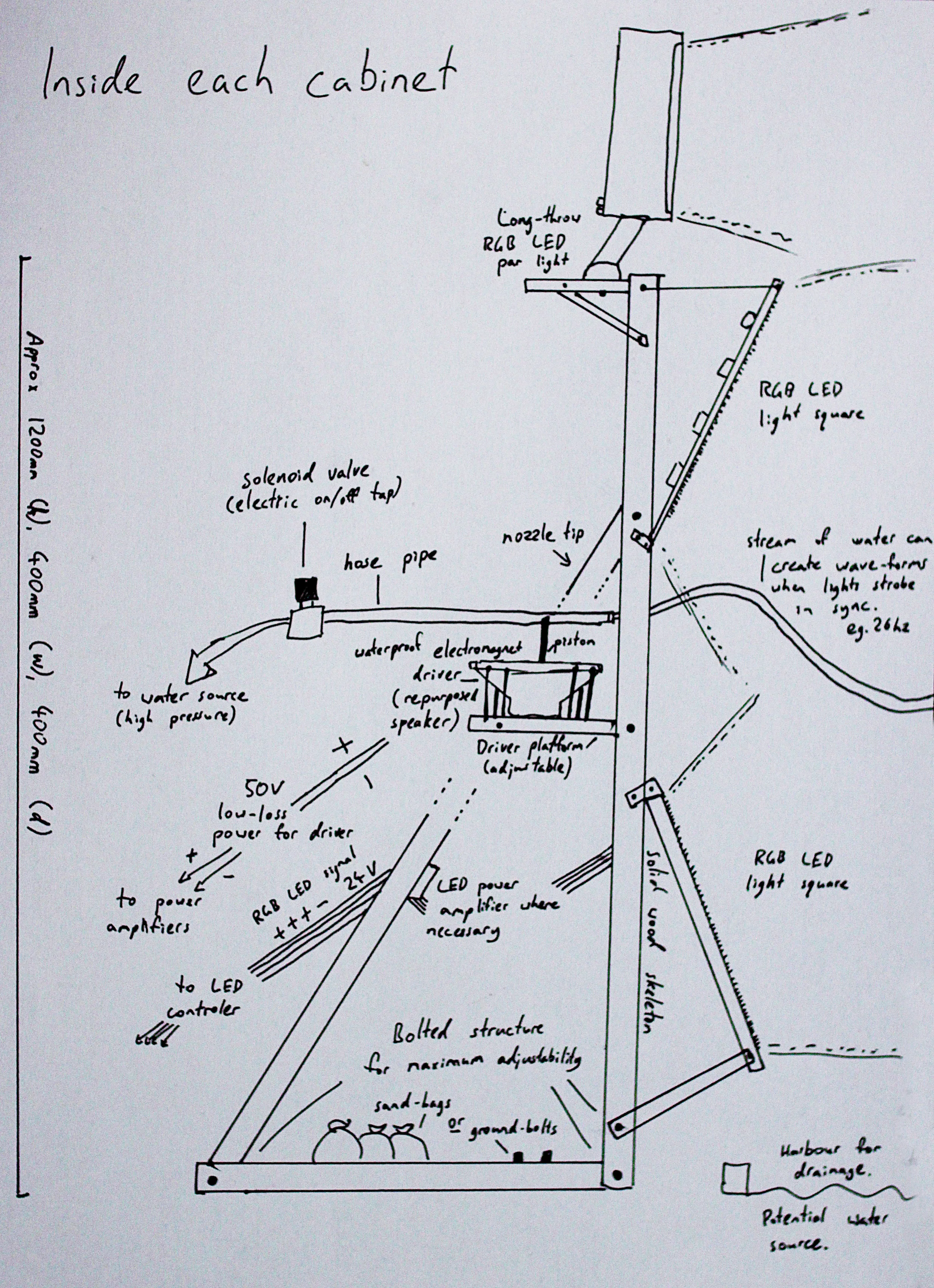 Sketch of cabinet internals. These are the robots that provide the electromechanical drive for water on/off, water "shaking" and lighting sequence.