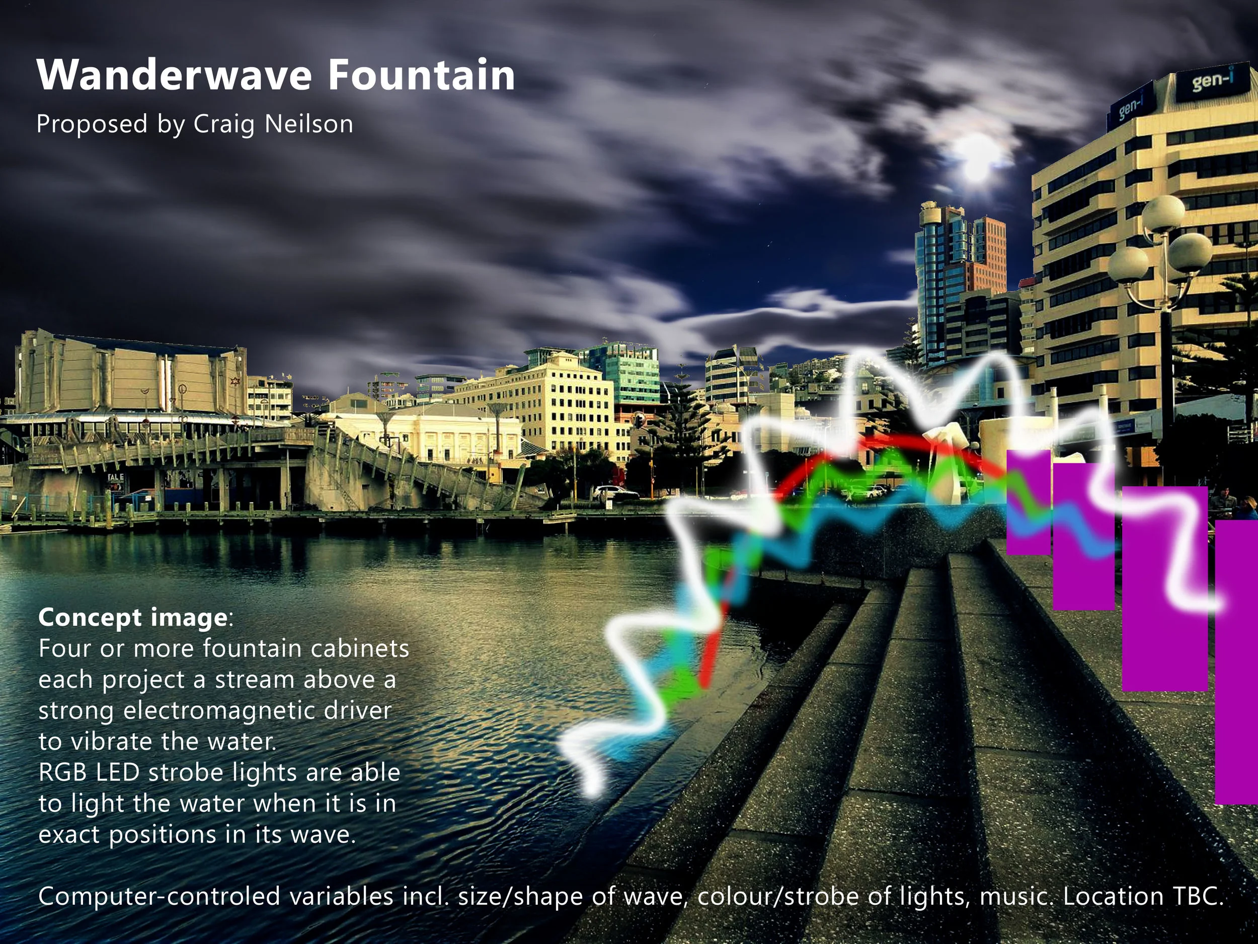 The Wanderwave will be set to an event-specific music track as well as having a freestyle interactive mode controllable from a MIDI keyboard. There is also the daytime possibility to create live wave-shapes in the air based on microphone input, for example an "oooo" sound will look different to an "eeee" sound. Participants (ie audience) will be encouraged to interact with the water and music (eg dancing around it, even touching the water) with some people invited to "play god" on the MIDI keyboard or vocalise in to the microphone.