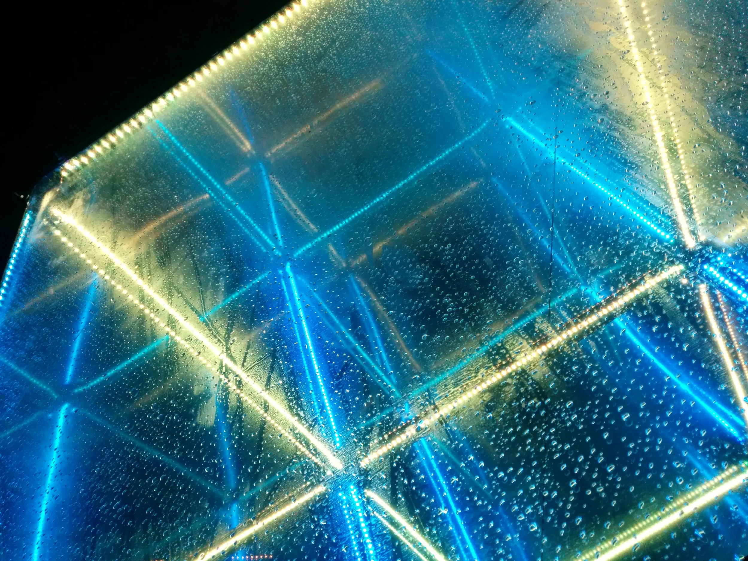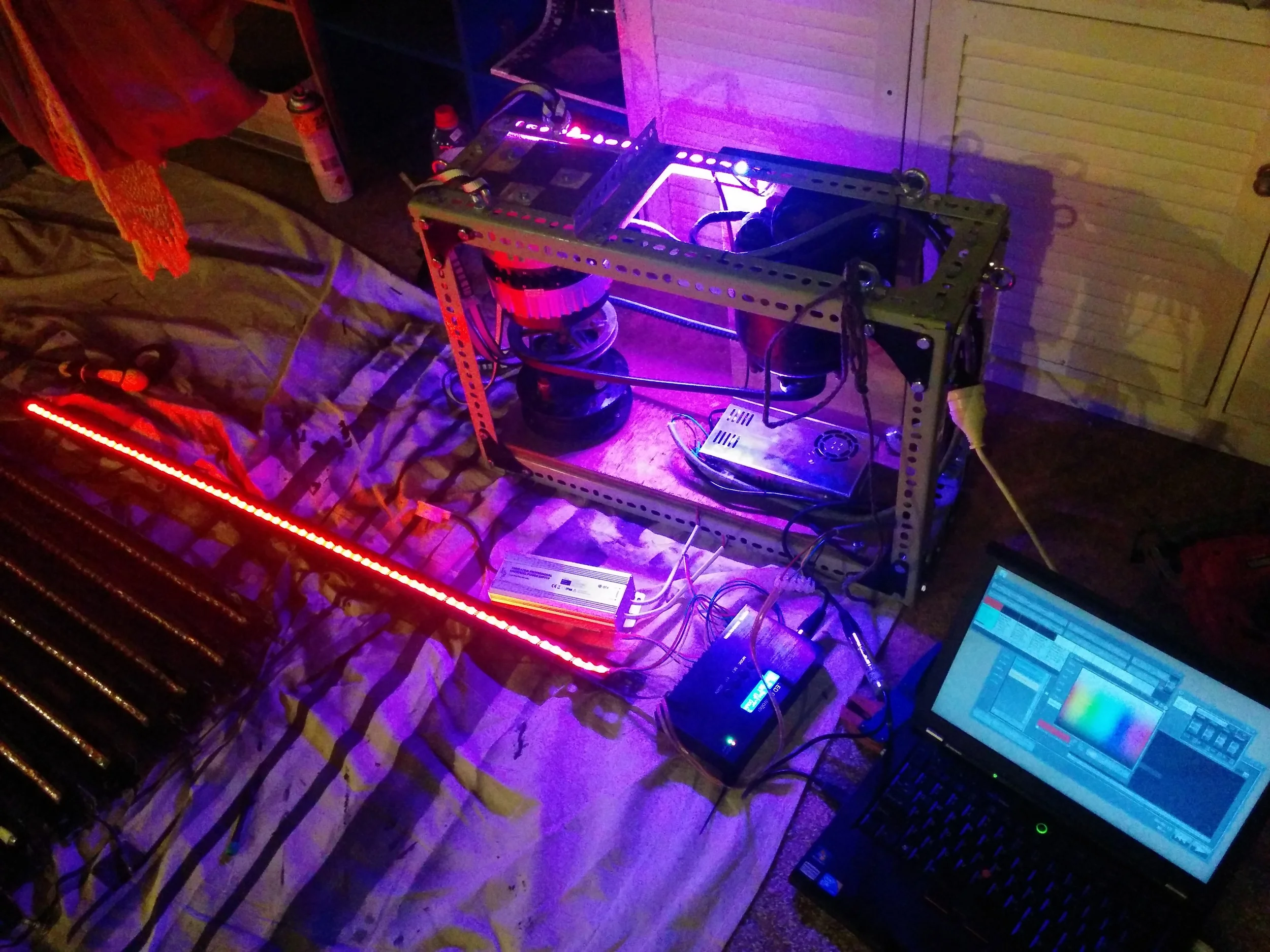 My next challenges were around materials and technicalities to create the cube. After investigation, I settled for high-powered LED strip and L-shaped steel edges reinforced by a nylon tension line. The sides were 1.2m each in length allowing for 1000 individual RGB lights to be used. I am not a trained builder and I consider my workshop to be "amateur" but I am determined to get great results from my computer work, soldering and "spanner turning".