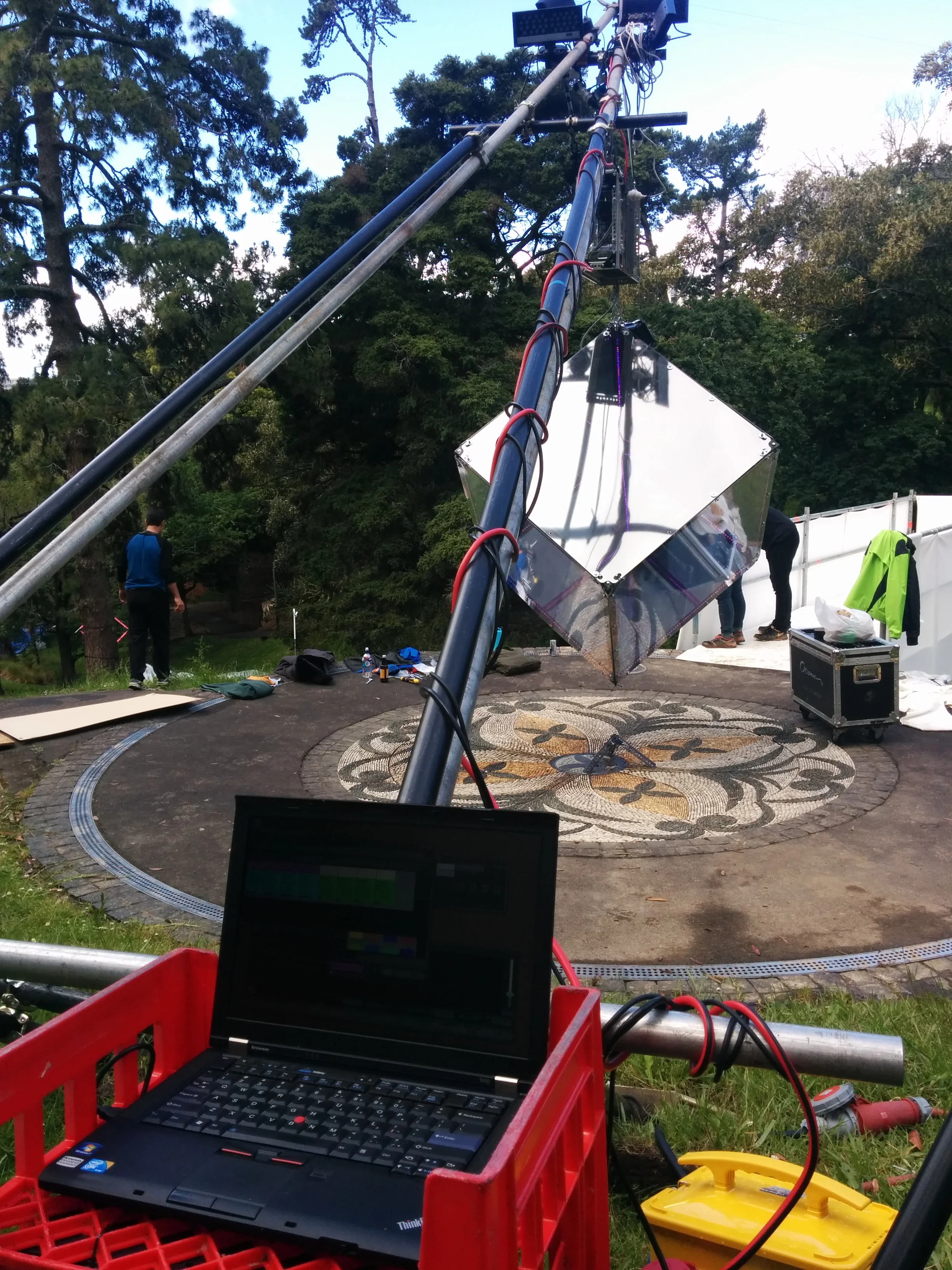 Each new location required a different experience to be developed. For the premiere at Art in the Dark, Yashoda ran a scripted sequence with custom-made sound and lighting programs (as seen in the video above). At Kiwiburn (pictured above) with a smaller audience I designed the experience for a longer and more interactive involvement. Participants were able to directly "play" the lights on a MIDI keyboard, and rotate the sculpture with their hands. At Prana Festival the work was adapted to analyse a microphone and respond to the live sound. At Splore I developed sequences for a classical music experience.